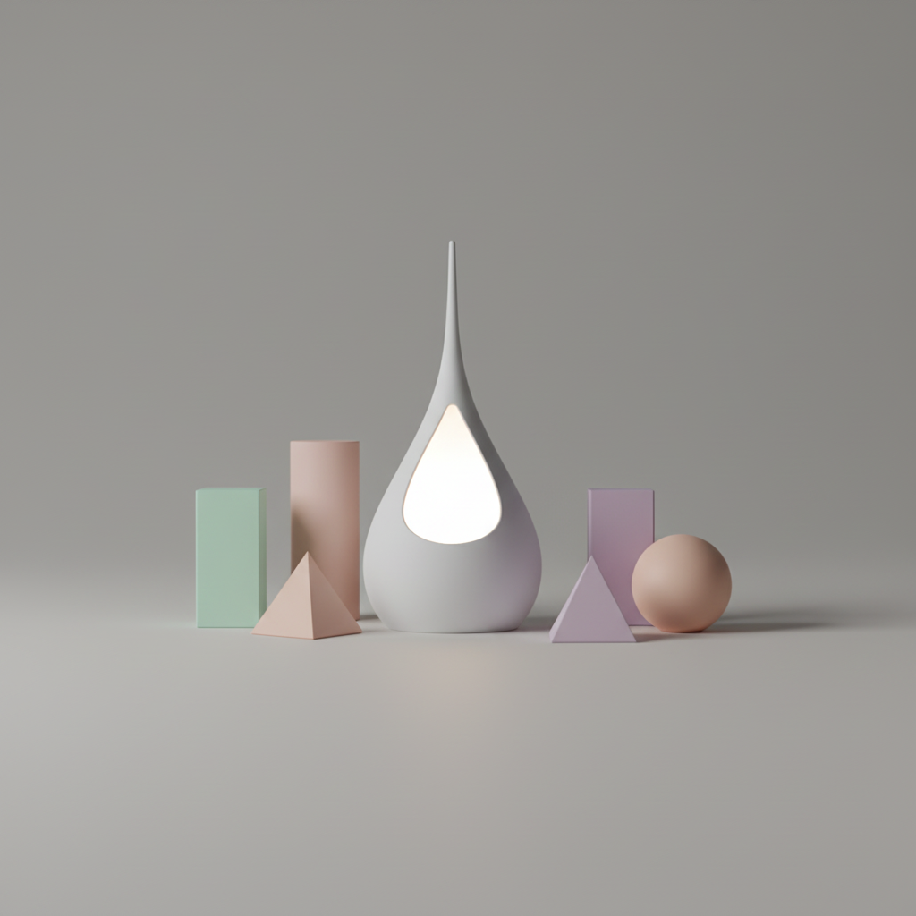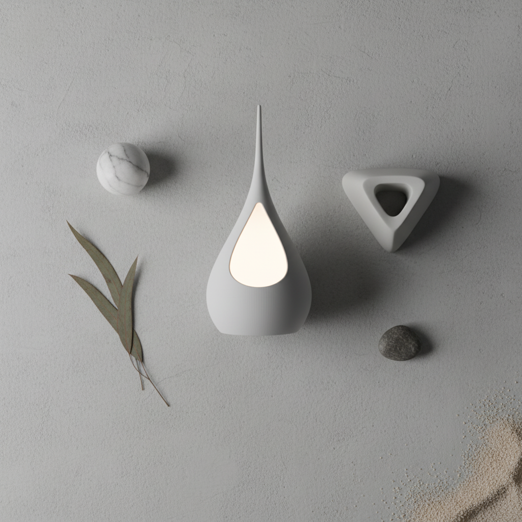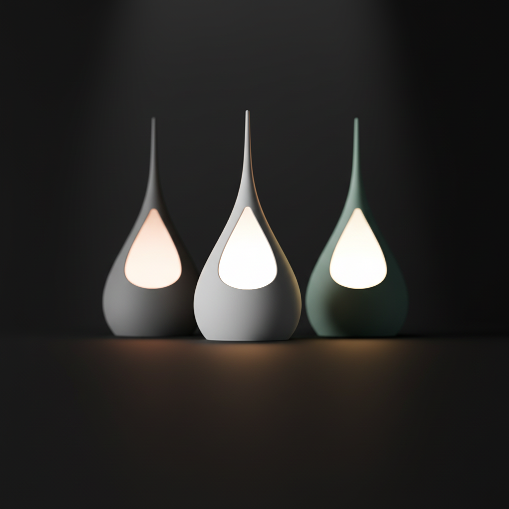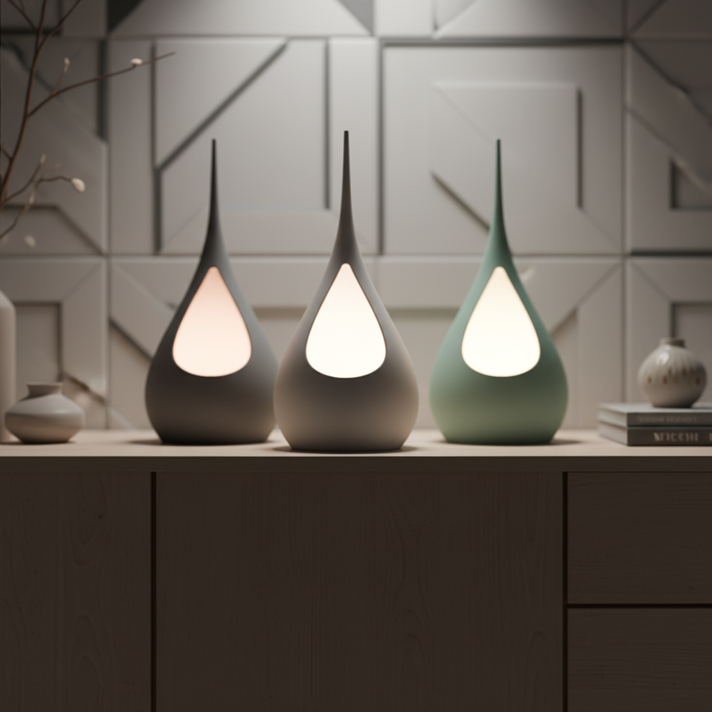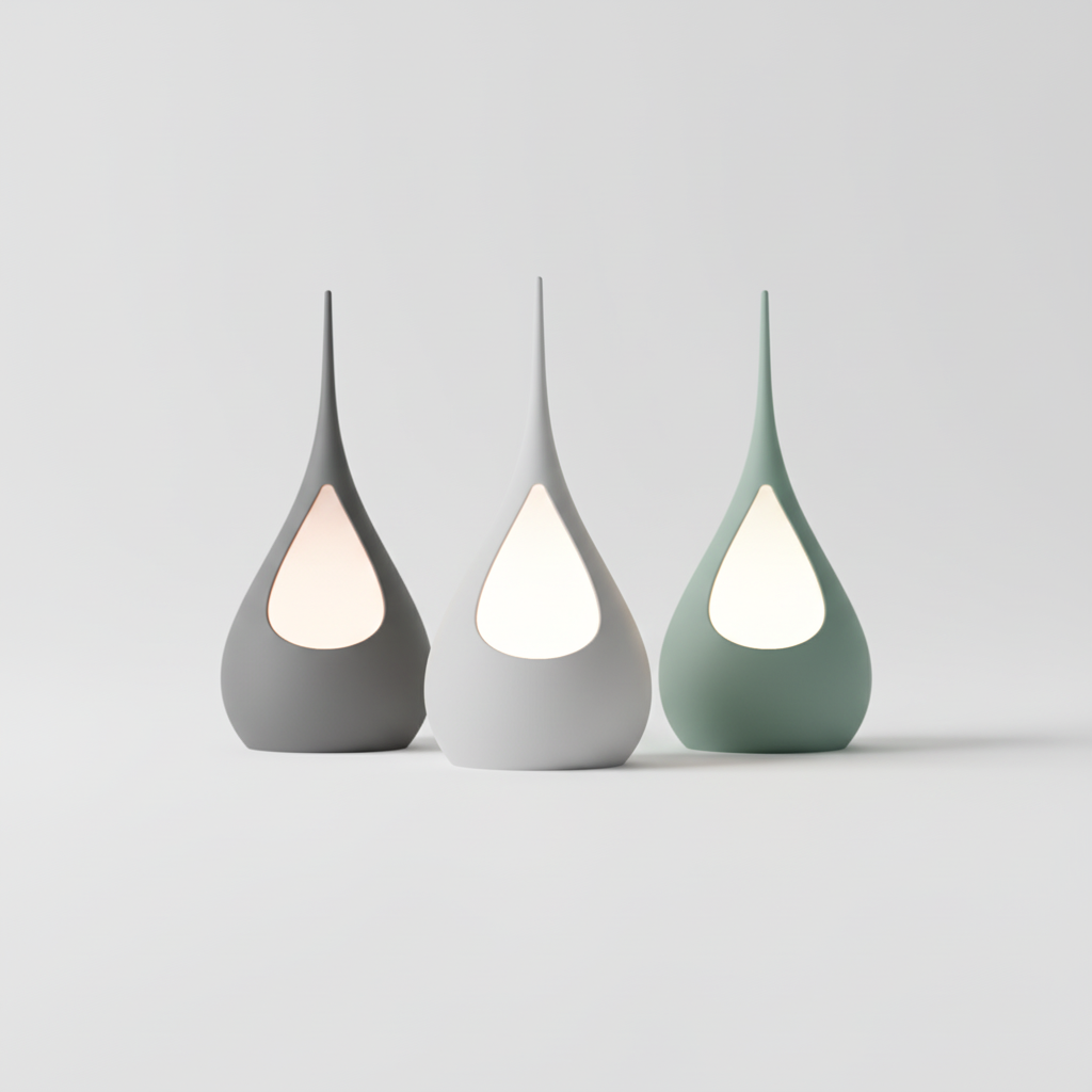 Su forma orgánica, suavemente curvada y rematada en punta, emite una luz ambiental y difusa a través de una apertura central, creando un efecto visual cálido y acogedor. Fabricada con tecnología de impresión 3D para lograr un acabado impecable y de alta calidad, es ideal para quienes buscan una decoración única y con estilo.